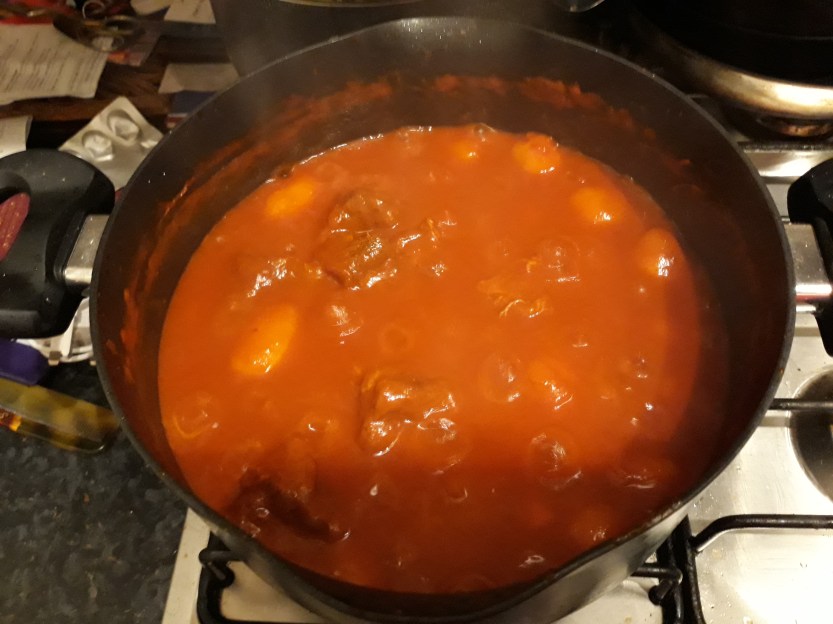 Add the tomato sauce and the sliced or tinned tomatoes, salt, pepper, a bit of cayenne pepper and of course a lot of sweet paprika! As with all tomato dishes, don’t forget to also add a teaspoon or two of sugar to take away the sourness. Reduce the heat, add a glass or two of water, and let your goulash simmer for about two hours; and remember to stir and add some water every 15-20 minutes! (You might want to set an alarm, like I do…)