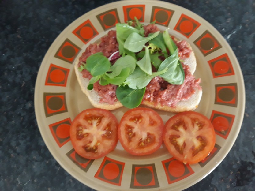 So, spread the liverwurst on the bread slices, put the salami slices on them, top with the gherkin slices and the other bread slices. Wonderfully piquant and enormously nutritious!