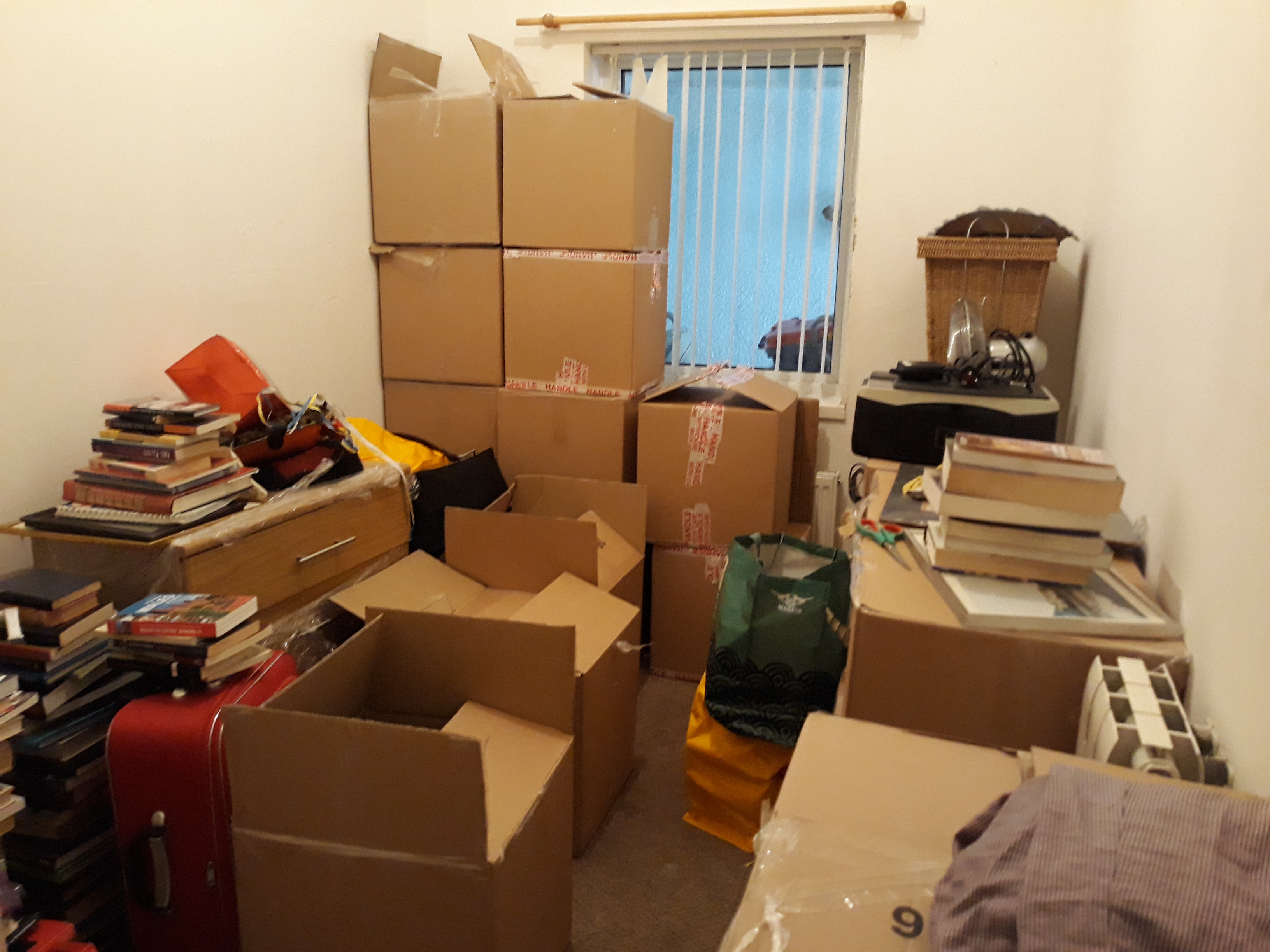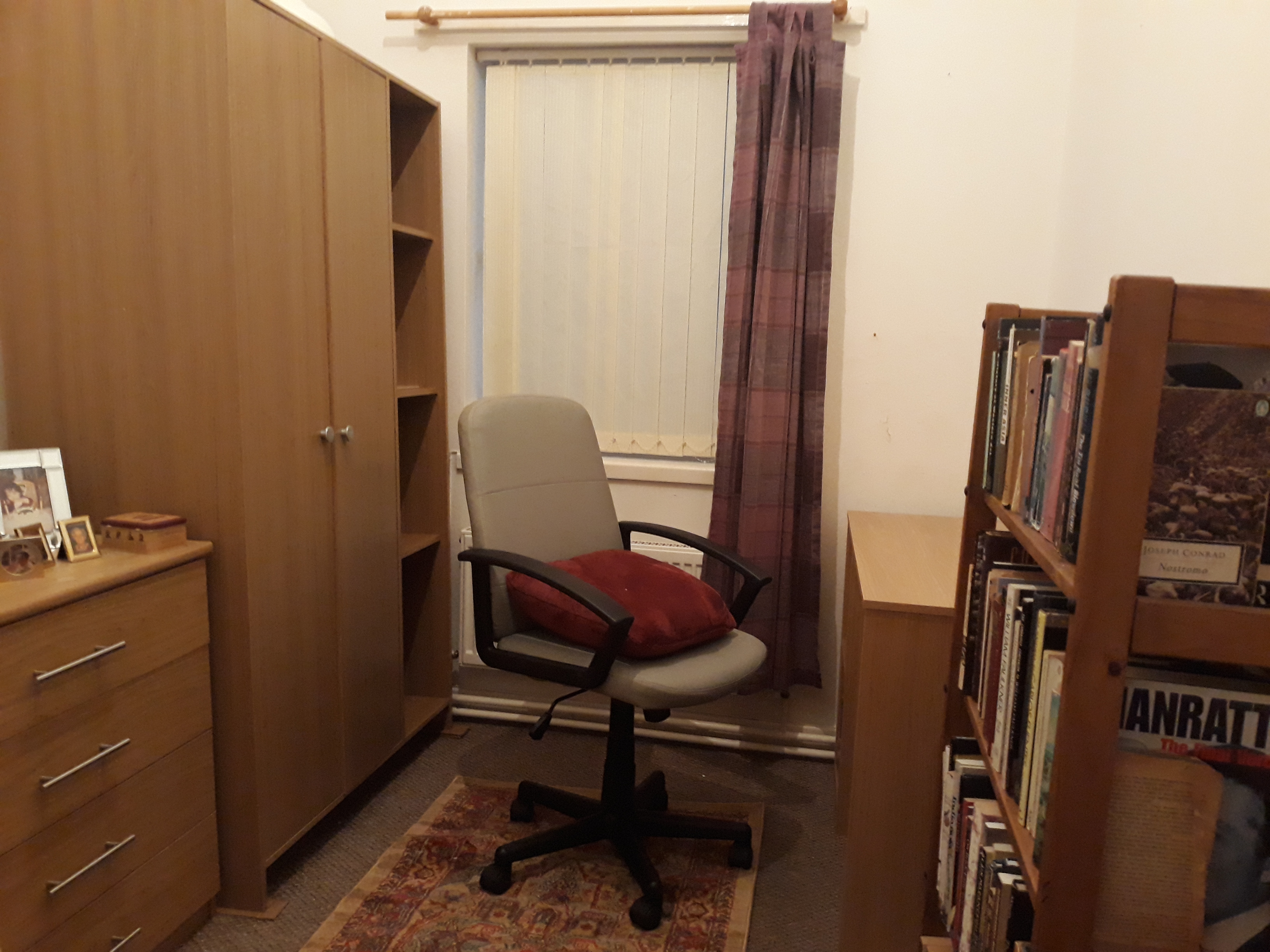 Just in time for Christmas we made it, dear friends: our new flat in lovely Wales is as good as complete! As I told you in my last post, we ordered all our new furniture as flatpacks and saved a lot of money that way – and had a lot of fun, too, assembling all our new things. And last week, we did the last three of them: the second wardrobe and the desk for my darling husband’s office, and a sideboard for the dining room to house all our DVDs and CDs. We made it without help this time, even though the wardrobe was quite a bit of work! So, now the office is complete; it’s turned from a storeroom into a beautiful workspace.