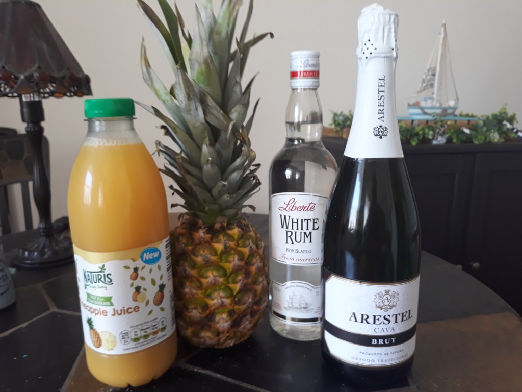 200ml white rum, 500ml pineapple juice, 700ml champagne, 1 pineapple or 1 tin of pineapple chunks.