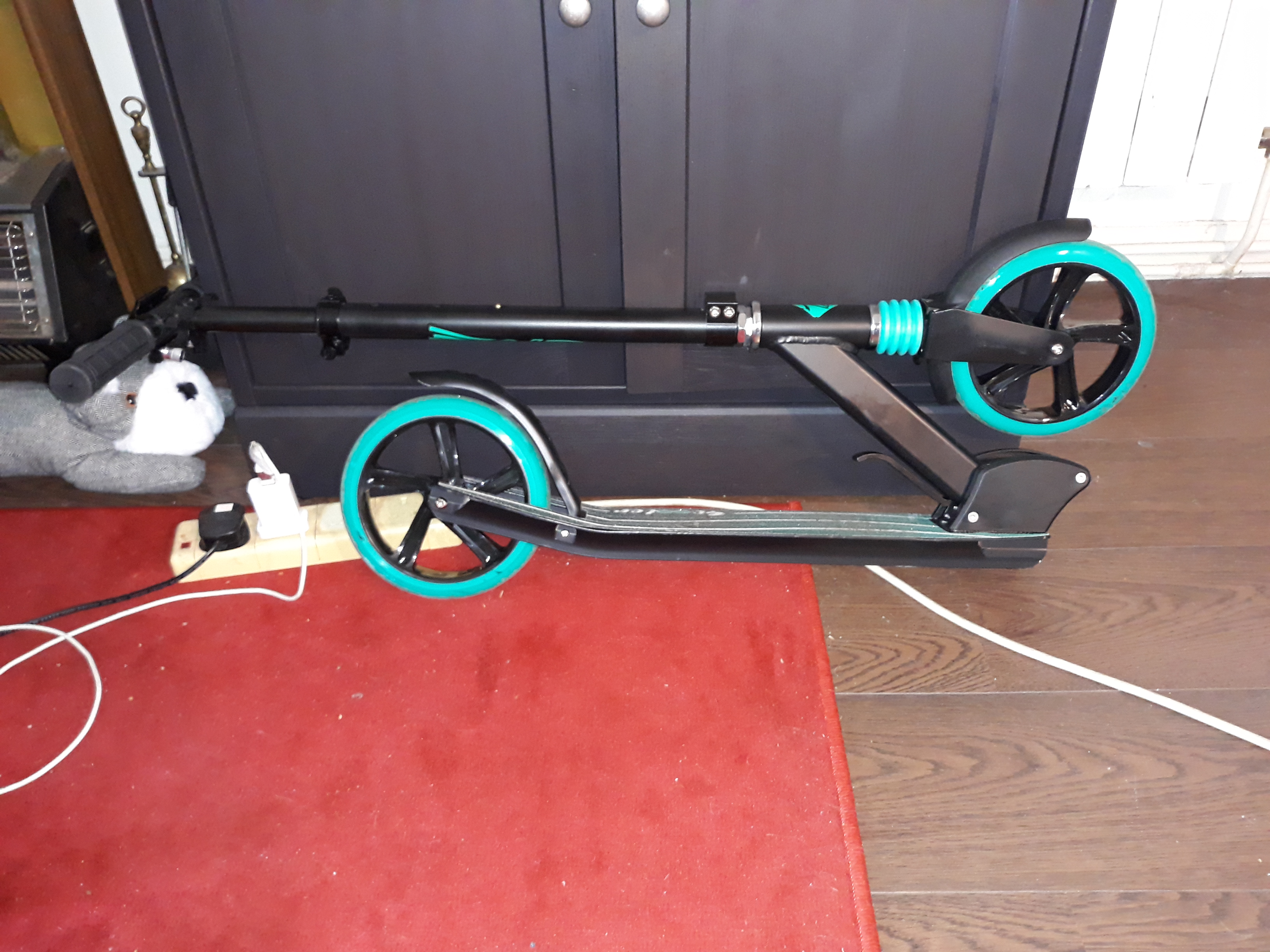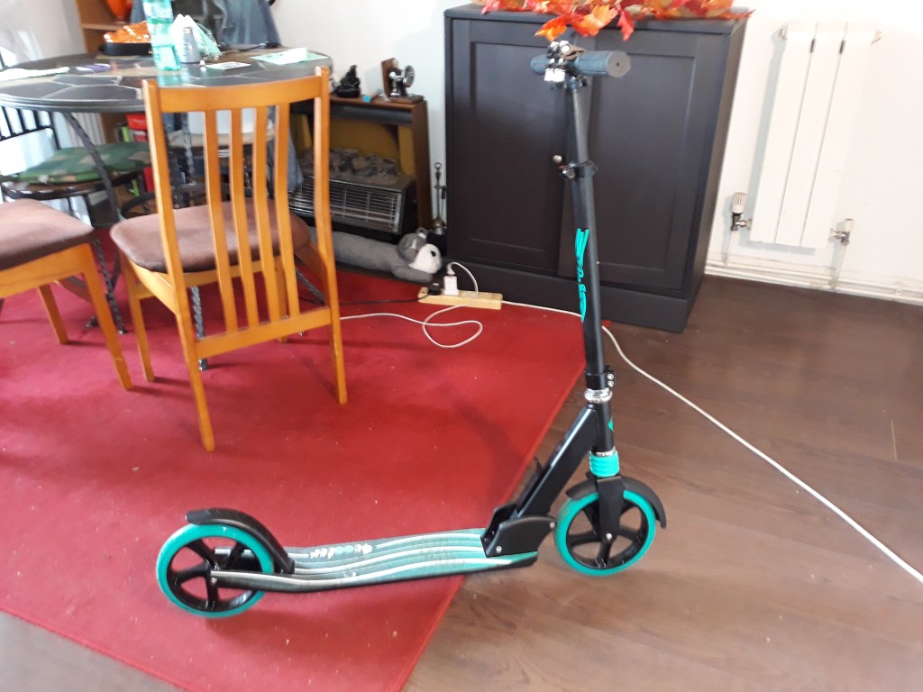 This model is a bit bigger and more stable than the one I had 10 years ago (since I’m older and heavier now…), it’s got nice big wheels and a brake, so it’s safe for people of all ages to use; I decided it looked like a boy, and I named him Tom – as in a Tom for a tomboy… Like most modern scooters, it’s lightweight metal, it folds up and you can take it with you indoors anywhere you go and just put it in a corner.