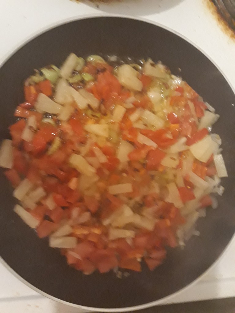 Slice the celery, chop the onion, pepper and tomato, fry in another pan with hot olive oil for 2-3 minutes, then add the pineapple chunks, fry for another 2-3 minutes until they start to soften.