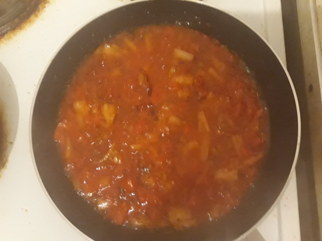 Then, add the chili sauce, passata, honey, salt, sugar and chili flakes; keep frying for 10-15 minutes until the sauce is going gooey and the vegetables are getting soft; add a little water if necessary.