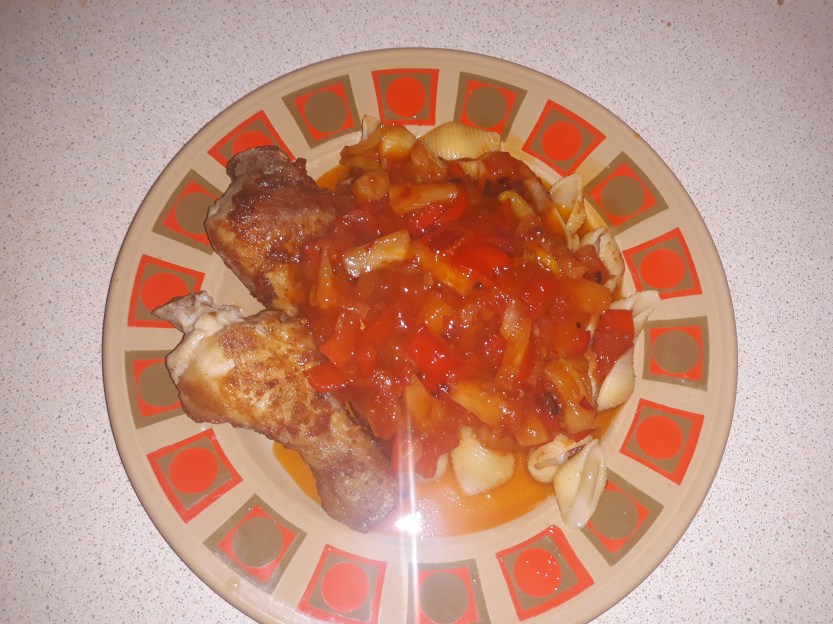 I’ve been combining it with other elements of East Asian cuisine, and I’ve worked out the ingredients for a really scrumptious sweet-and-savoury sauce that goes very nicely with both chicken and pork; my favourites are chicken drumsticks, though – juicy and tasty with all their lovely skin on.