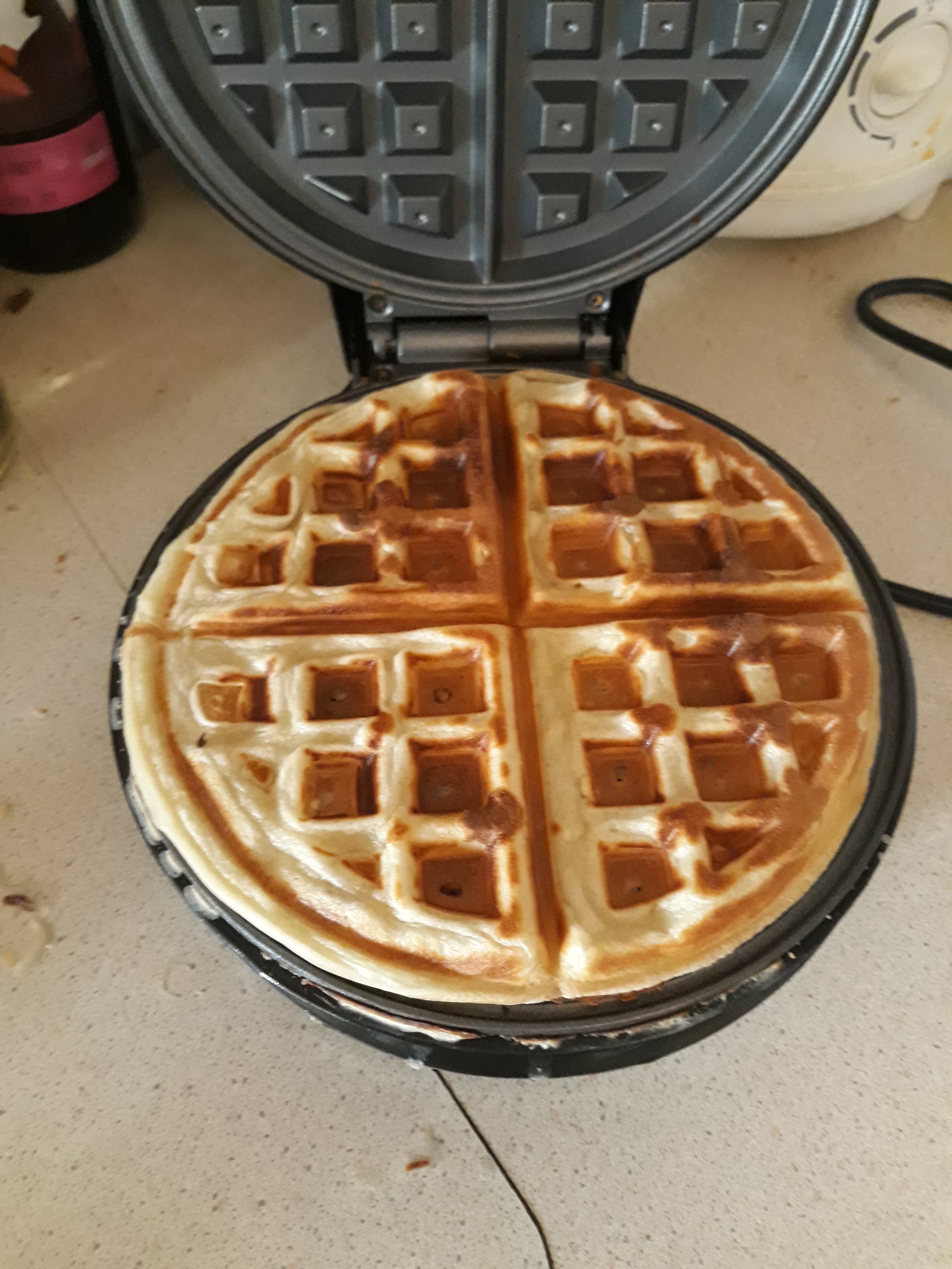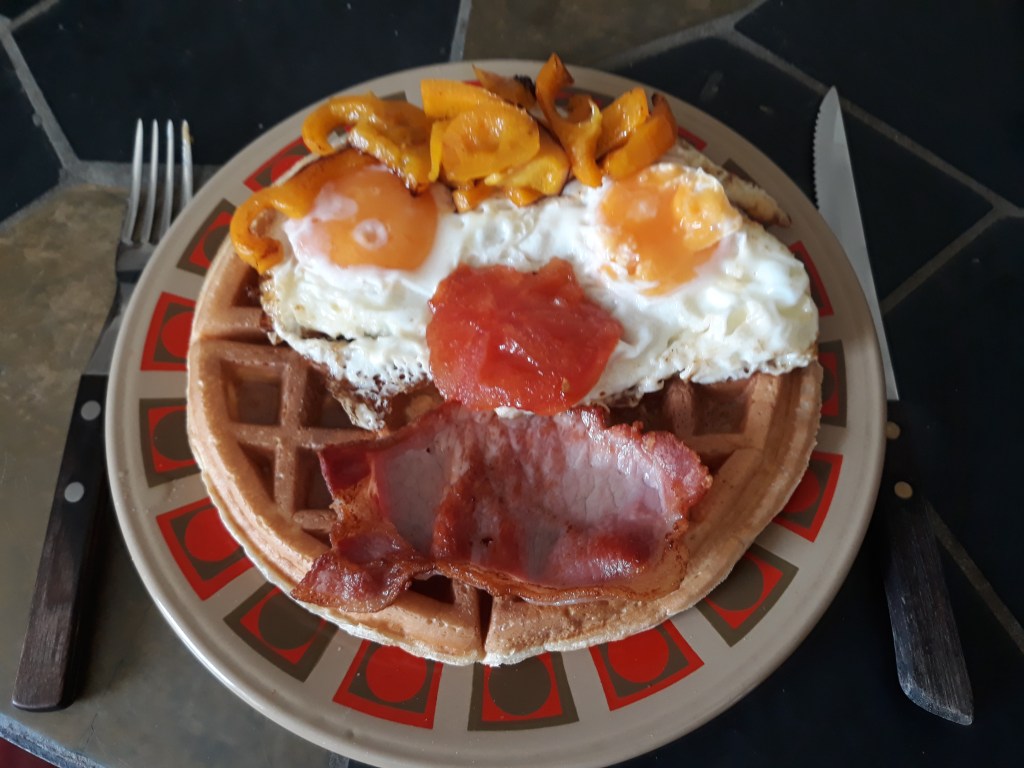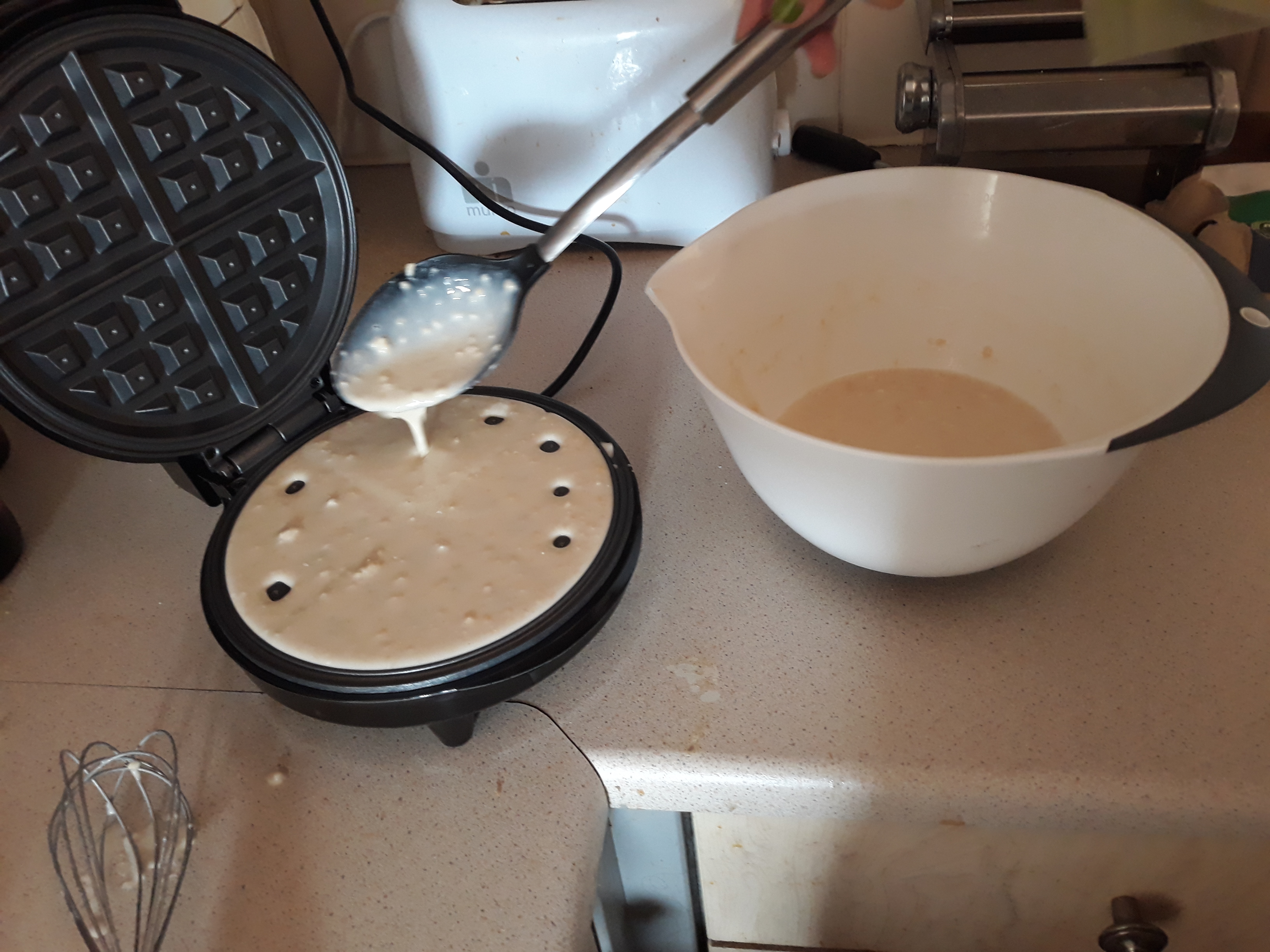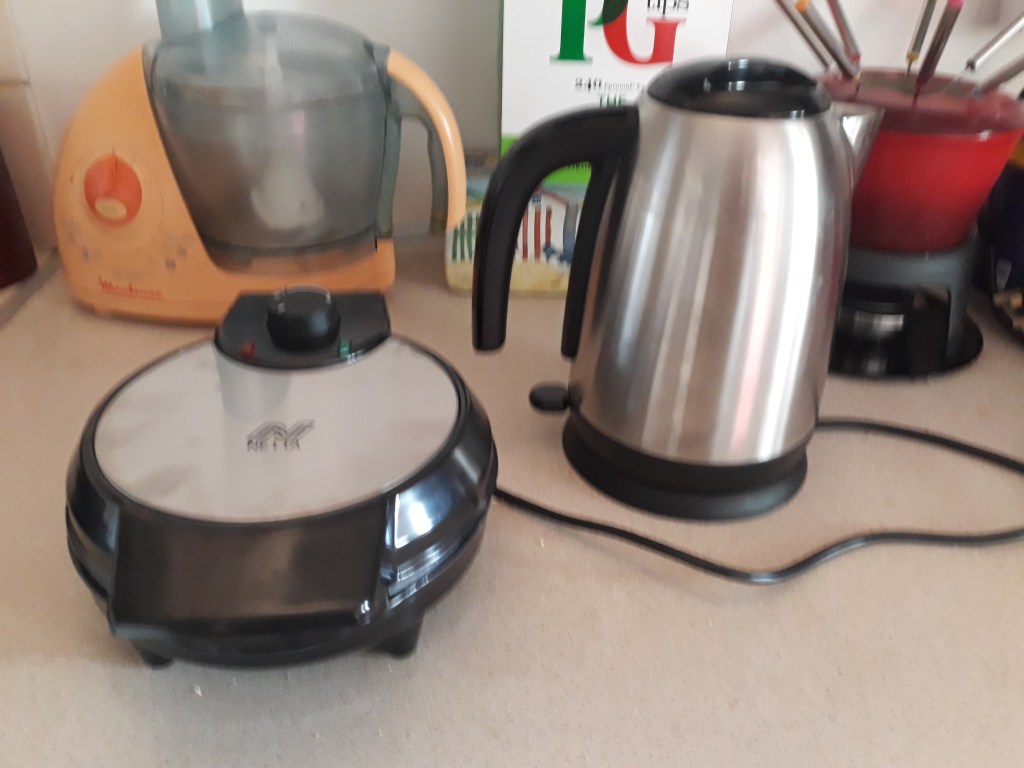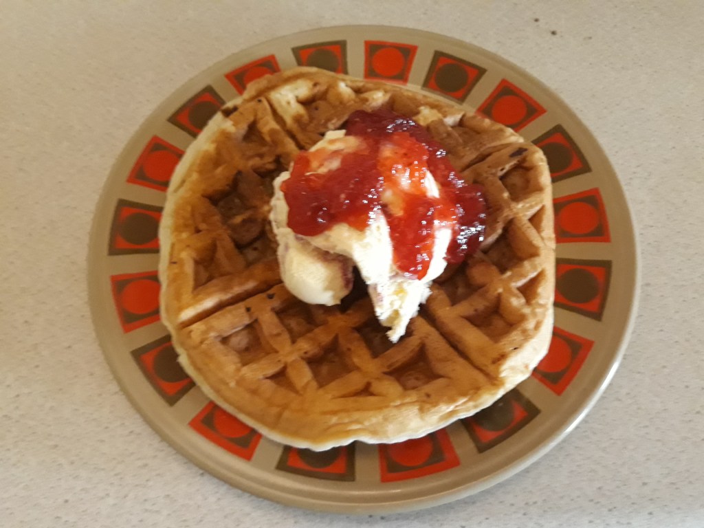 While I’m working on the next part of Roberta’s Timelines, let’s go back to cooking, dear friends: I’ve got another new kitchen gadget, one I’d been thinking about for some time – a waffle maker! What could be nicer for breakfast, or tea, or indeed any old time of day or night, to be able to make some fresh waffles yourself in no time with your own waffle maker? And it makes a perfect set with our new kettle, too – and no, neither of them are designer models, they were about £16 each; just have a look online for one…