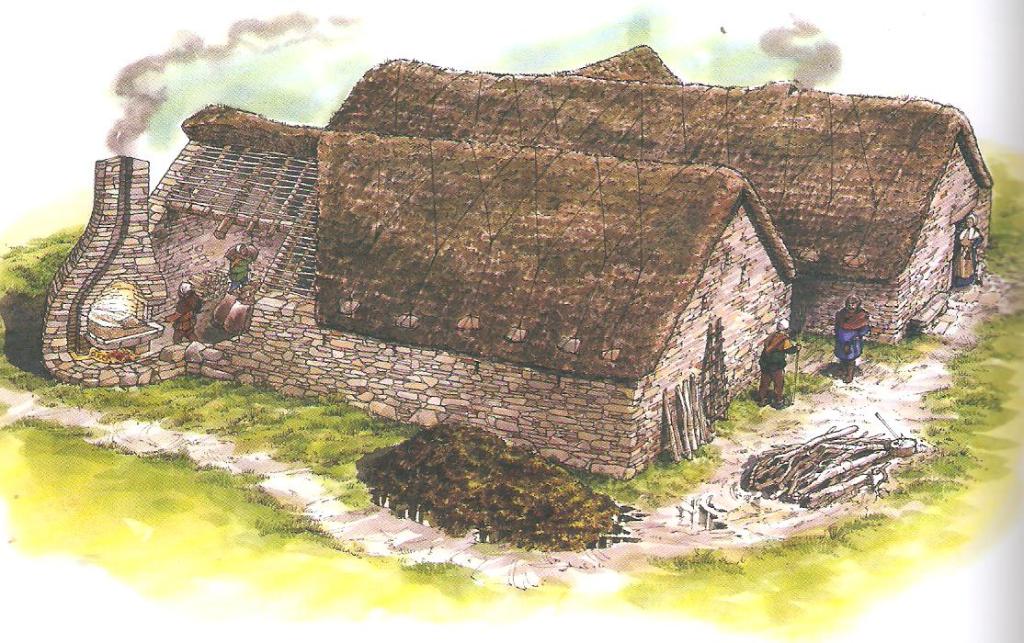 Then, around 800 AD, Norsemen from Norway started raiding the Scottish coasts, and soon they arrived on Shetland as well. A Viking family built an extensive farm here, not far away from the old Celtic settlements; their way of building was much different from all the others, though. They built their longhouse rectangular, with stone and turf, and they even added the luxury of a bathhouse. There were servants’ quarters, indicating that the family who occupied the large main building had great power over the others, there was a smithy and a cow shed.