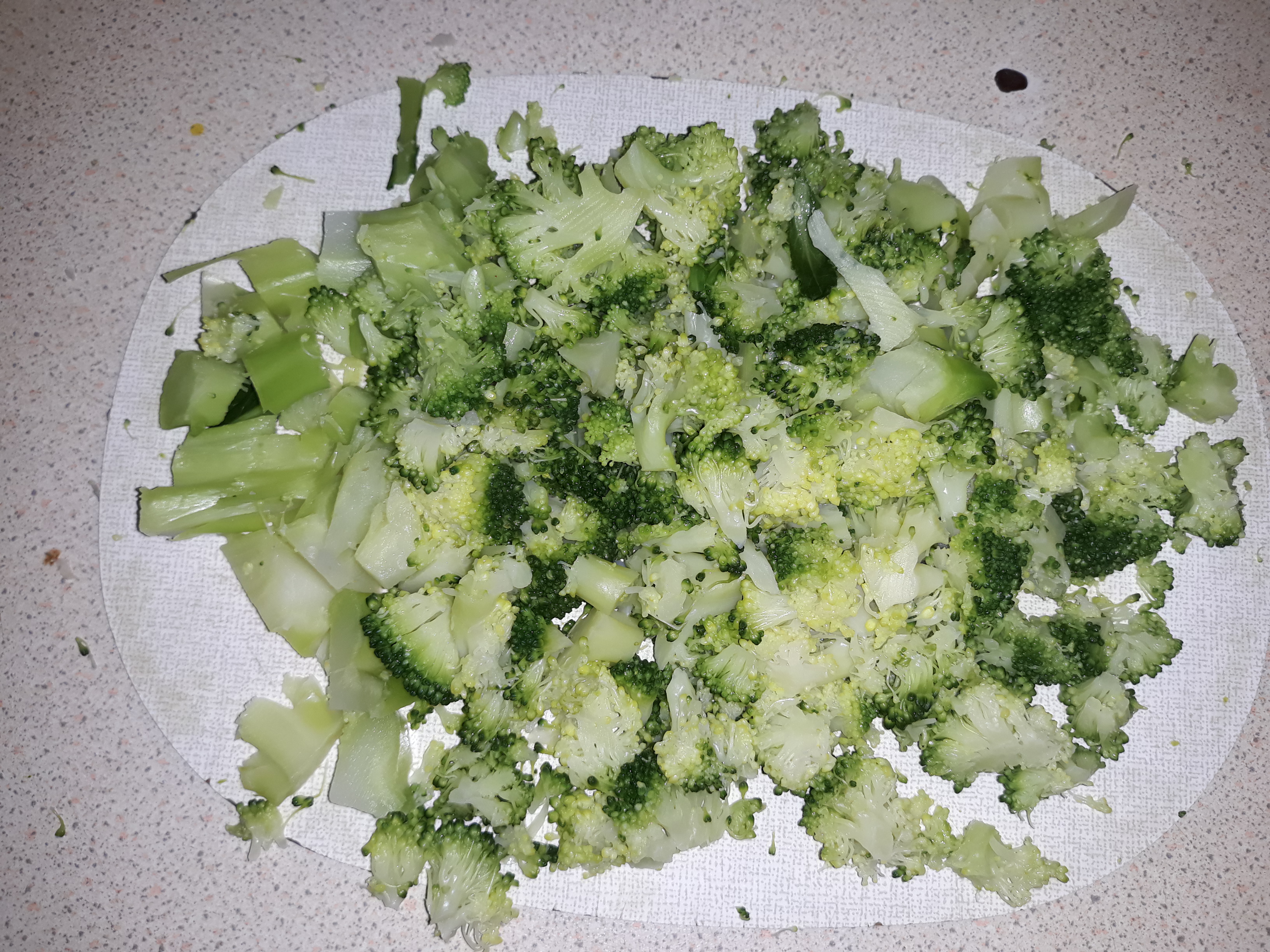 Cook the broccoli (cut into chunks) in salted water for 10 minutes, sieve and let it cool down a bit, then chop it.