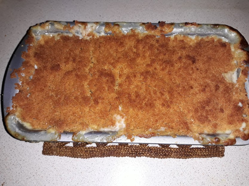 Then, one day, I remembered that when I was a kid back in Germany, my Mum used to get those frozen fish fillets with a delicious sauce on top that made the fish so much more bearable – and I realized, looking online, that it’s simply fish fillet au gratin, with a bechamel sauce and breadcrumbs, and, of course, endless possibilities for variations!