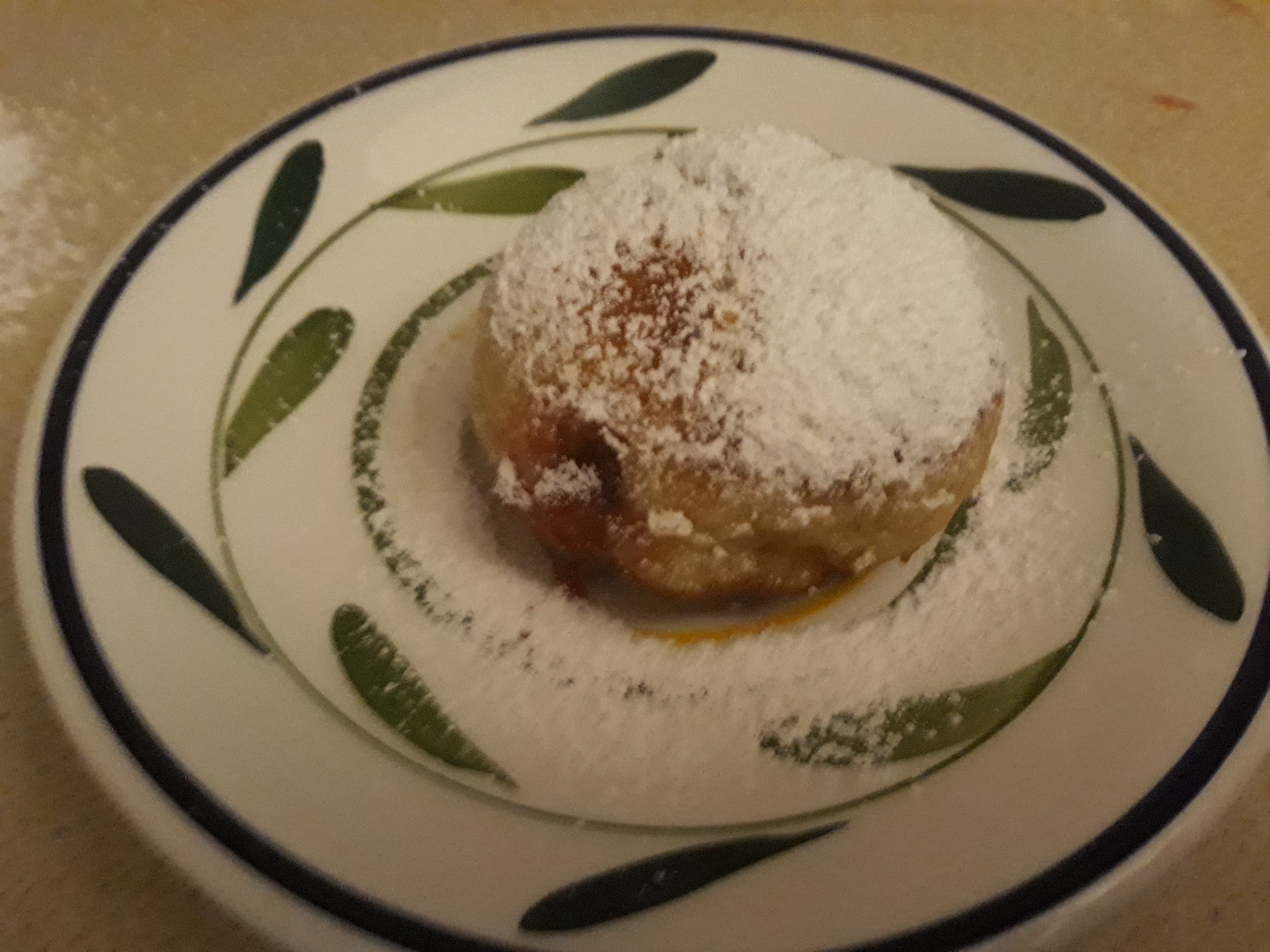 100ml milk, 30g sugar, 1tsp yeast, 2 egg yolks, 40g butter, 1tsp vanilla extract, 250g flour, 150g jam (apricot or strawberry), 1 pinch salt, 30g icing sugar, oil
