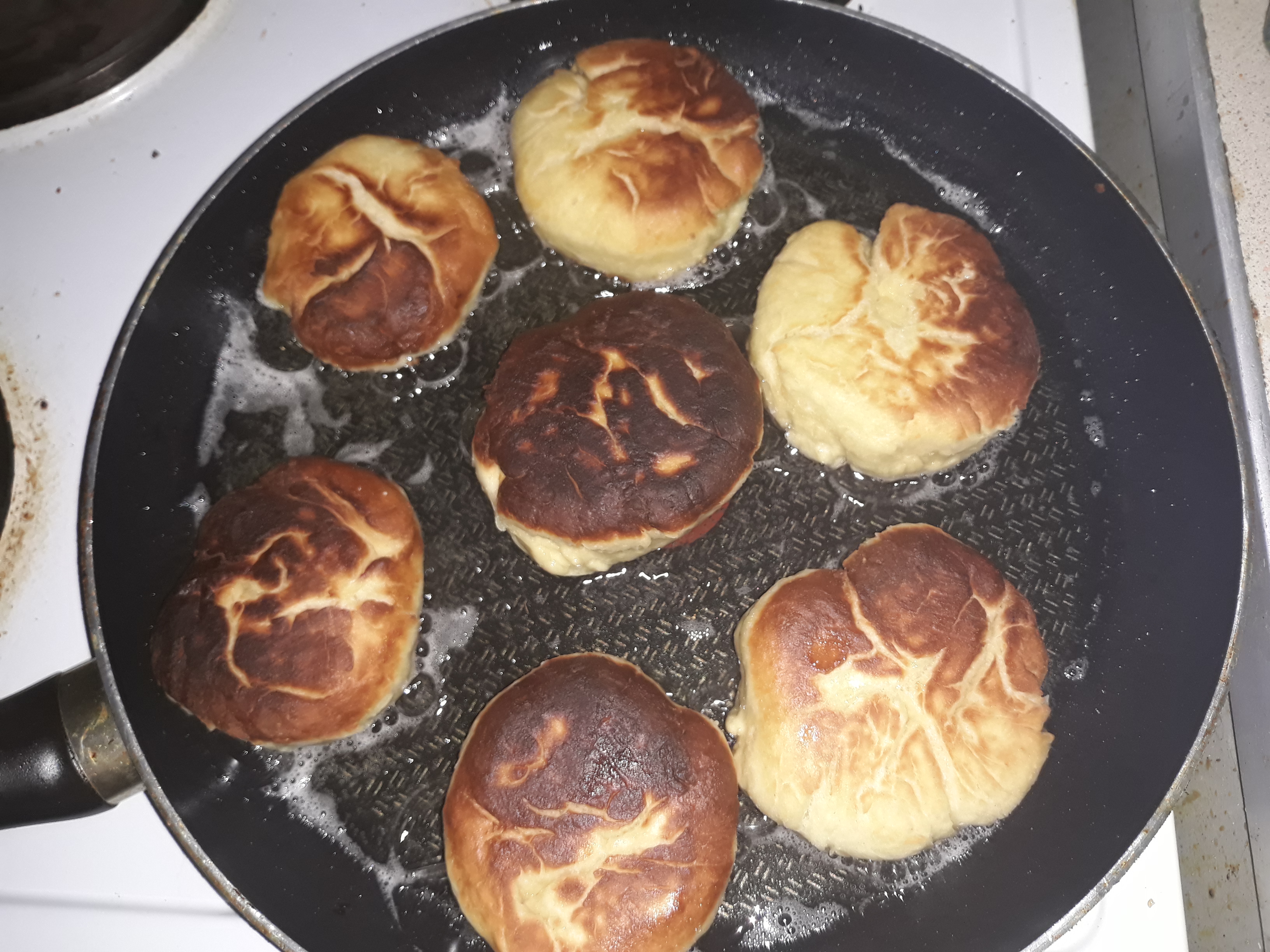 Heat up a lot of oil in a big pan (to medium heat, not too hot – as you can see from the photos, mine turned out a bit too brown) and fry the krapfen in it from both sides for about 3 minutes until they get slightly brown, then take them out back onto the baking tray, this time laid out with kitchen towel, and let them cool down for 10-15 minutes.