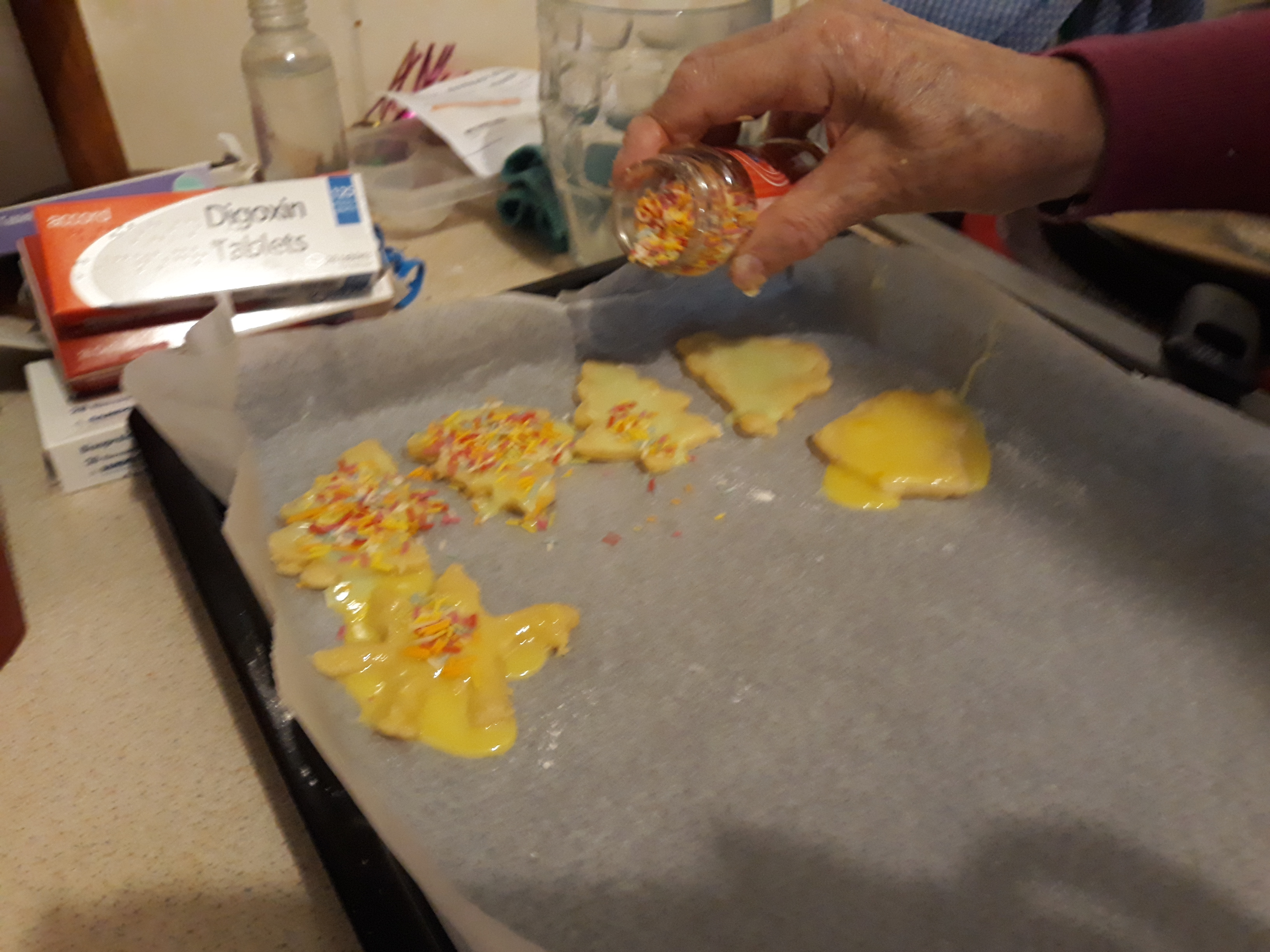 When you’ve finished, take away the surplus dough and put it in the fridge with the rest, then put your cookies on a baking tray laid out with baking foil and start decorating them. Brush them with the icing and sprinkle your decoration on them until they’re really colourful!